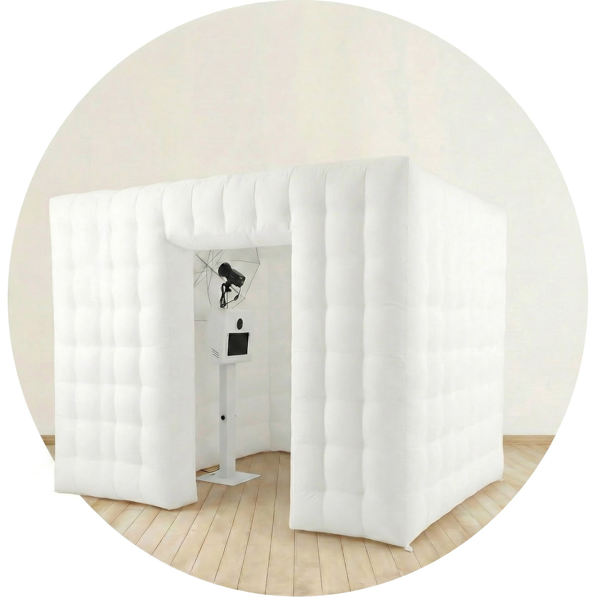 Our White Inflatable Cube turns your photo booth into a fun, private mini-studio. We place our Open Air Photo Booth inside this glowing white cube, so guests can loosen up, be silly, and take their photos without feeling like the whole party is watching — which always leads to even better, more authentic shots. Inside the cube, you’ll still get our true studio-quality setup with a professional camera, flattering studio lighting (never iPads), and custom-designed photo templates that perfectly match your event theme, plus unlimited prints, instant digital sharing, and an online gallery with all of the night’s photos ready to download.